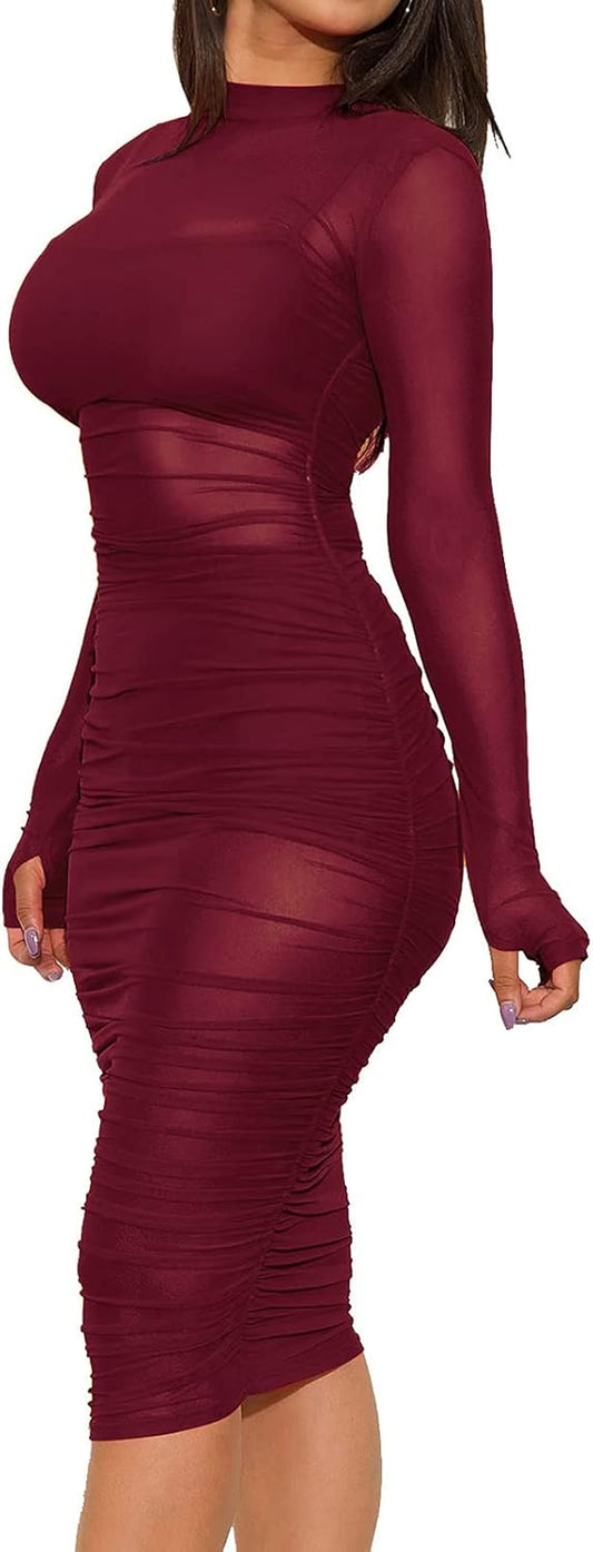 Womens Sexy Bodycon Midi Dresses See through Sheer Mesh Cover up Ruched Dress + Crop Tops + Shorts Party Club Bodysuit Wine Red M