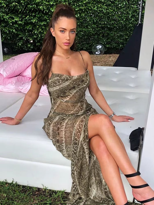 Snake Print Chiffon Sexy Women Long Party Slip Maxi Sheer Dress Strap Backless Slit Elegant 2023 Autumn Clothes